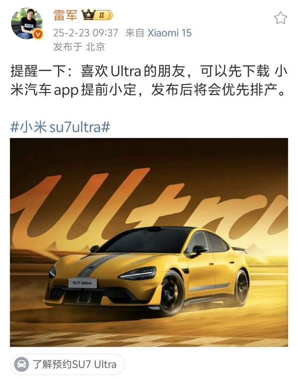 雷军在微博发文喊话那些喜欢Ultra的朋友,可以先下载小米汽车app提前小定,发布后将会优先排产。考虑到当前小米SU7的产能问题,优先排产很可能能够大幅减少等待时间。此前,雷军曾表示,规划的小米SU7Ultra年销售目标为1万台,而新车在去年发布会后,就在10分钟取得了小订3680台的成绩,要知道,新车的预售价来到了81.49万元,且小订金额要1万元,这样依旧有这么多人毫不犹豫的小订,可以说其很可能会成为同价位车型中的一个爆款。